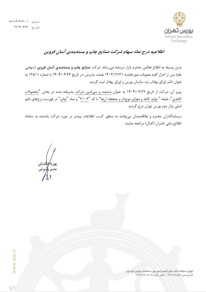 تاریخ دقیق عرضه سهام صنایع چاپ و بسته بندی آسان قزوین (آسان پک) با نماد «چاپ» به زودی اعلام خواهد شد.